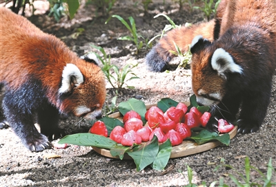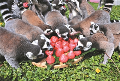 小熊猫第一次吃莲雾,一副很轻松地享受的样子。狐猴岛里,饲养员装着满满的一簸箕莲雾,环尾狐猴纷纷从各个方向迎过来,围在一起享用。